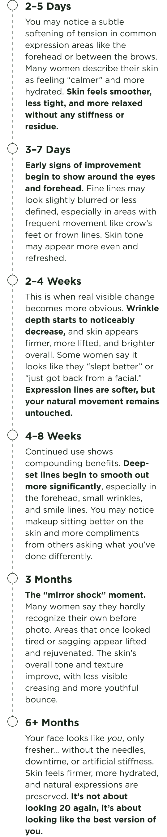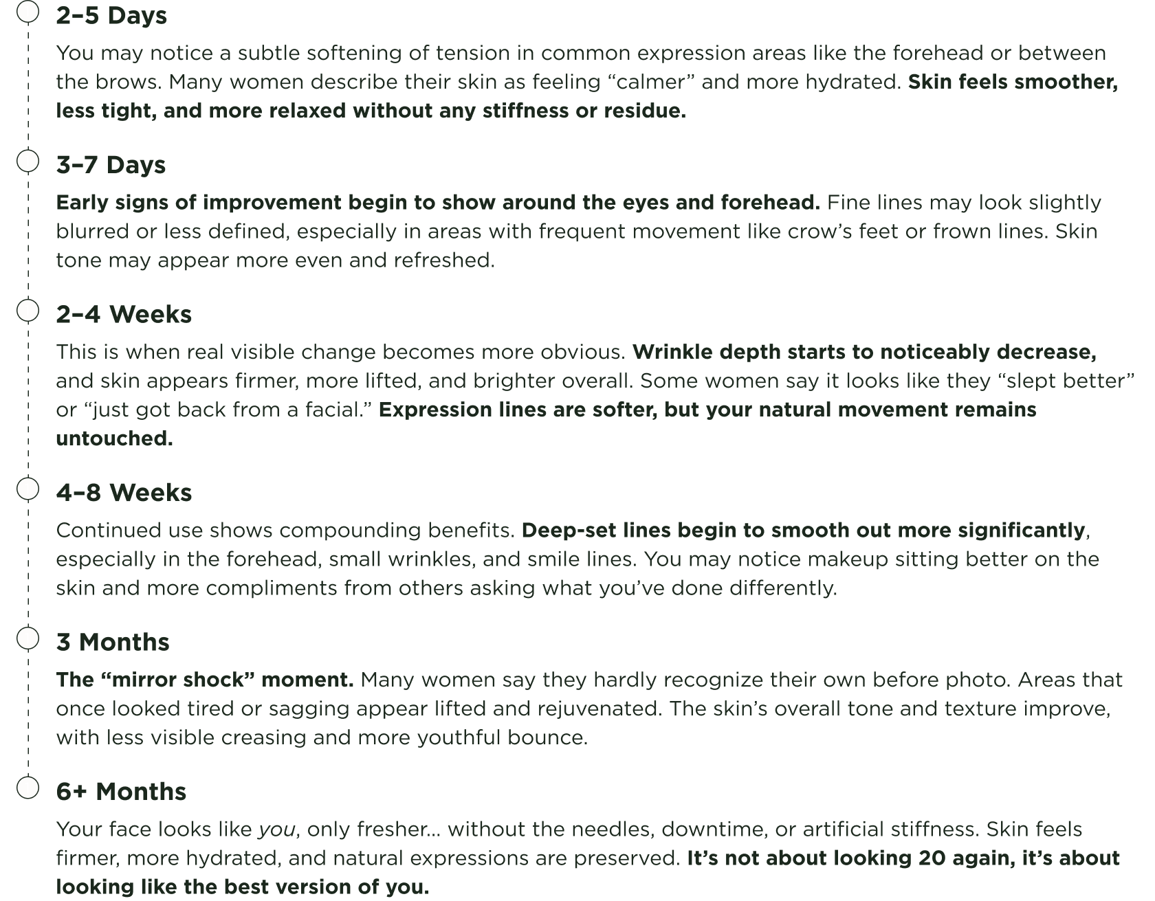 Early results (including softer lines and a more lifted look ) can appear in as little as 2 to 4 days. Clinical studies show wrinkle depth reduction of up to 52% within 28 days.*